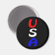 "USA", l'abréviation des Etats-Unis d'Amérique, en lettres rouge vif, blanches et bleues contre un aimant noir.