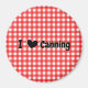 Un aimant de cuisine amusant avec des chèques en vichy rouges et le texte, j'adore la conserve où le mot amour est remplacé par un coeur.