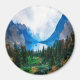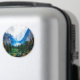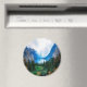 Un aimant avec une belle photo d'une agréable et tranquille scène nature. Forêt verdoyante à l'avant et montagnes bleues à l'arrière. Avec un ciel blanc nuageux et onirique. Ambiance mélancolique et magique.