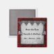 Ce mariage gothique déplaisant sauve la date présente un motif de soie rouge ondulant dans l'arrière - plan, avec des bijoux noirs foncés et de la dentelle métallique sur le dessus. Il y a des paires de petits crânes argentés aux yeux rouges, accrochés aux chaînes de chaque côté. Cette faveur de mariage sombre et romantique est présentée dans une plus grande suite de papeterie gothique mariage qui se compose d'annonces assorties, invitation, RSVP et d'autres faveurs de mariage gothique correspondants que vous pouvez consulter à ce lien : https://www.zazzle.com/collections/blood_roses_and_silk_red_gothic_wedding-119200349504887025