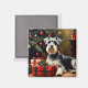 Schnauzer Dog Christmas—assis près du sapin de Noël attendant d'ouvrir son cadeau de Noël.