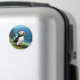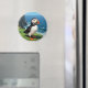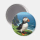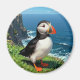 A sweet puffin magnet that has a cute illustration of a puffin sitting by the sea on an seaside dune or ledge.