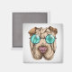 Ce dessin présente le portrait d'un chien de Sharpei portant des lunettes turquoises teintées.