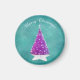 This magnet has a shiny dark pink Christmas tree sitting on a white star shaped rug with bright silver star ornaments on a teal coloured background. Customise the Merry Christmas text with the template.