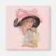 Jeune femme sirotant un soda tout en portant un grand casquette noir avec grand arc rose. Une magnifique scène vintage.