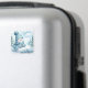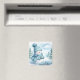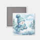 L'hiver est arrivé et ce petit bonhomme de neige reste douillet dans son casquette bleu, foulard et mitaines. Un petit oiseau bleu sur son épaule. Il tient une tige d'herbe avec un arc bleu. Aquarelle neige poussiérée arbres accent l'arrière - plan enneigé. Un aimant hivernal ludique avec un bonhomme de neige adorable et souriant.