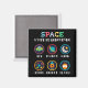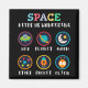 Playful space themed artwork made for curious kids and young students. Cute symbols like UFO, planet, moon, stars, rocket and alien help children explore space science and basic astronomy in a fun and friendly way.