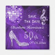 Elégant, glamour 50e anniversaire / Cinquantième anniversaire Magnet Réservez la date. Un éblouissement branché et glamour Sauvez les dates pour vos célébrations du 50e / 50e anniversaire. Magnifique, éblouissant argent scintille diamants bijoux bling note musicale image, funky violet/lilas/lavande rétro disco miroir boule et argent glittery stiletto talon haute image de chaussures de mode sur un arrière - plan chic violet/lilas/lavande. Un mignon, classe, à la mode, élégant, joli enregistrer l'aimant de date pour les femmes. Les femmes adoreront ce design cool, amusant, funky, girly pour leur musique glamour et la danse 50ème/Cinquantième fêtes.