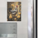 A beautifully detailed oil painting of a black and white speckled hen surrounded by vibrant yellow roses and ornate wrought ironwork. Rich texture and golden tones create a timeless farmhouse aesthetic.