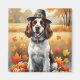 Un tableau aquarelle d'un chien gai assis au milieu d'un tas de feuilles d'automne vibrantes, entouré de minuscules citrouilles et de glands épars. Le chien porte un petit casquette pèlerin et des poutres de joie, capturant l'esprit de Thanksgiving. Dans l'arrière - plan, les champs de moissons et les arbres dorés créent une ambiance campagnarde paisible. Des textures douces et des tons d'automne chauds et feutrés confèrent à la scène une atmosphère cosy et nostalgique parfaite pour célébrer la beauté de la saison.