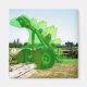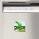 Un joyeux stegosaurus de dessin animé vert assis sur le sol, regardant vers le ciel à gauche du cadre superposé au-dessus d'une photo d'une vieille machine avec de grandes roues, formant un "squelette" pour le dinosaure.