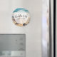 Un aimant avec une photo pittoresque. Une grande étoile de mer dressée sur une plage de sable. Une belle mer bleue avec des vagues de surf blanc en arrière - plan.