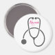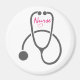 Un aimant avec "Nurse" écrit dans une police de caractères cool avec un petit coeur rose en dessous. Conçu avec une simple illustration de stéthoscope gris.