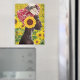 Cette oeuvre d'art contemporain présente un portrait serein d'une jeune femme africaine. Elle se tient gracieusement dans un champ de tournesols plein de vie, ses yeux donnant un regard de méditation paisible. Un bandana rouge frappant orne sa tête, avec un tournesol délicatement placé dessus, symbolisant la force et la beauté. L'oeuvre mêle éléments traditionnels et esthétique moderne, célébrant l'élégance culturelle et l'essence habilitante des femmes noires.