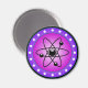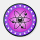 Image thématique scientifique. Image circulaire avec le symbole de l'atome à l'intérieur. Un arrière - plan rose contraste avec le symbole noir. Une bordure violette aux étoiles blanches entoure l'illustration. Une image cool pour les amateurs de geeks et de sciences.