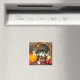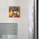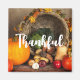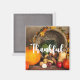 Un aimant avec la photo d'une récolte d'action de grâce, posé sur une table en bois rustique. Citrouille, pommes de terre, courge etc... composent cette belle collection de nourriture. Des feuilles d'automne colorées entourent le panier de la cornucopie.