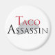 Aimant Taco Assassin. Un aimant avec l'expression "Taco Assassin" dans la police romaine de Trajan sur la silhouette d'un taco gris. Un grand cadeau pour les amateurs de tacos, de jeux vidéo et de parodie.