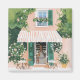 Un gouache d'un café pittoresque avec volets verts et balcon fleuri surplombe un coin salon extérieur animé. La lumière du soleil filtre à travers, invitant les clients à profiter d'un moment paisible au milieu de la verdure fleurie.