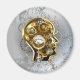 Tête conceptuelle, mécanique, humaine avec manomètre antique et engrenages métalliques contre arrière - plan industriel gris. Style Steampunk.