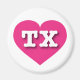 Cet aimant est doté d'un coeur rose chaud et vibrant contenant les lettres coques TX, blanches et audacieuses, l'abréviation officielle pour le Texas, l'état étoilé solitaire.