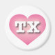 Cet aimant est doté d'un coeur rose avec un centre blanchi contenant les lettres coques TX, en gras, blanches, en haut, l'abréviation officielle pour le Texas, l'état étoilé solitaire.