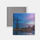 Transition nocturne-jour au-dessus de la tour Eiffel en hiver avec circulation ferroviaire (RER) au premier plan - Paris, France.