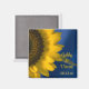 Customisez le joli tournesol jaune sur Blue Mariage Magnet avec les noms personnels de la mariée et du marié et leur date de mariage d'été ou d'automne. Créez un cadeau de mariage de garde personnalisé élégant, enregistrez l'aimant de date ou une faveur de douche nuptiale unique. Cet élégant aimant mariage à fleurs personnalisé présente une photographie florale d'un arrière - plan bleu portant une fleur de tournesol jaune et une feuille verte.