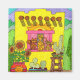 Ces trois chats curieux sont assis dans la fenêtre encadrée de rose d'un adobe de style taos jaune vif qui habite le sud-ouest américain. Des cactus et des tournesols richement texturés dans des pots de talavera colorés, ainsi qu'un soleil peint sur la fenêtre, accentuent la maison, offrant un contraste de bienvenue au sable du désert. Montagnes violettes et verdure égayent l'arrière - plan sous un ciel bleu vif et sans nuages.
