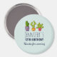 Un aimant de remerciement d'anniversaire avec une illustration fantaisiste représentant 3 petits cactus heureux assis dans leurs pots de fleurs. Ils ont chacun leurs propres expressions uniques, souriantes et jolies. Arrière - plan de pois vert à la menthe.