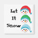 Trois visages de bonhomme de neige avec un gros grain et un nez de carotte. Un avec une toque rouge, un en vert et un en bleu. Dit : Laisse-le neiger !