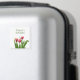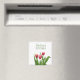 Cet aimant comporte un nom écrit vert et une deuxième ligne de texte vert foncé en lettres bloc serif sur un ensemble de fleurs de tulipes rouges.