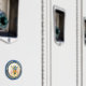 The coat of arms of the Turks & Caicos Islands is infused into a faux gold circle shape which is set between a faux gold laurel wreath.