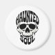 Crâne noir et blanc gras avec typographie incurvée 'Hanté'/'Âme'; motif gothique à fort contraste pour les fans d'Halloween, de rock et de mode urbaine à la recherche d'un bord intrépide.