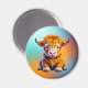 Adorable mignon petit aimant de vache de montagne avec un arrière - plan bleu et orange.