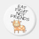 Aimant frigidaire vegan mignon avec une belle vache en caricature marron avec la légende Mange fruit pas d'amis en noir toutes les polices manuscrites casquettes.