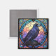 Décoré de vitraux, un corbeau déplaisant éffrayant tourne son regard vers le spectateur.