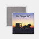 Une silhouette d'un cheval Amish et buggy se déplace à la fin de l'après-midi tandis que le soleil se couche dans l'arrière - plan. Texte : The Simple Life.
