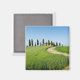 Aimant photo souvenir avec une route courbée à travers les cultures céréalières vers une villa agricole avec une rangée de cyprès devant elle près de Pienza dans la vallée du Val d'Orcia en Toscane, Italie.