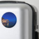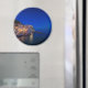 Magnet photo rond avec la petite ville de Manarola, l'une des cinq célèbres villages de la colline des Cinque Terre, construite sur une falaise surplombant la mer Méditerranée, avec les lumières pendant l'heure Bleue au début de la nuit en Ligurie, Italie.