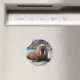 Walrus themed magnet with a cute walrus laying on a sandy beach by the ocean on a sunny day. Background of cliffs and blue ocean waves.