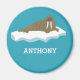 Créez un cadeau personnalisé cool pour quelqu'un qui aime les morses. Cet aimant frigidaire a une illustration d'un morse flottant sur un morceau de glace ou d'iceberg. L'illustration de style réaliste du morse est en marron contre un arrière - plan bleu turquoise. Il est prêt à être personnalisé avec un nom ou un autre texte sous le graphique en lettres blanches.