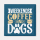 Les Amoureux de les chiens qui aiment aussi le café et les week-ends vont adorer ce design sur des sacs, des tasses, des T-shirts, et plus encore avec du texte de tan et blanc avec des fèves de café et un empreinte de patte de chien qui lit Weekends Café and Dogs!