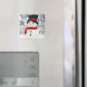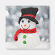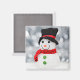 Un aimant avec une photo d'un mignon bonhomme de neige dans la neige.