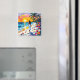 Add a touch of tropical beach to your home with this gorgeous colorful magnet. Hang up your notes or pictures on your frig with this cute beachy magnet. A beautiful ai illustration done in an oil painting impasto style. A woman walking on the beach among palm trees, tropical flowers, turquoise waves, sea glass and seashells.
