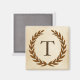 Une délicate couronne de laurier est posée sur un arrière - plan de papier parchemin dans le style romain classique. Ce design est personnalisé avec le monogramme "T" dans une tonalité de sienne riche.