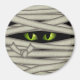 Une momie déplaisante et enveloppée avec des yeux verts brillants et des bandages de gaze classiques orne cet aimant rond du réfrigérateur. Également disponible dans une palette de couleurs orange. Cherchez ID685 pour voir la coordination des fournitures et accessoires de la fête avec ce grand motif momie.