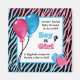 Est-ce un garçon ou une fille ? Envoyez ces amusants "sauvez la date" sexe révéler magnets de fête avec une bordure d'impression zèbre rose et bleu tendance et un ballon bleu cool pour un garçon à côté d'un ballon rose girly pour une fille et agrémenté de coeurs roses et bleus mignons. Personnalisez ces invitations baby showers posters de animaux à la mode en ajoutant le nom de la Mère à être.