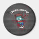 Un aimant macabre avec un zombie à l'allure cool, portant des vêtements déchirés et en lambeaux avec les bras tendus à la recherche de marques. De grands yeux vides avec une peau pourrie et écossaise. Le sang éclate derrière sa tête. Texte dit zombie hunter, en lettres courbes et est également personnalisable si vous voulez changer ce qu'il dit. Placez-vous sur un arrière - plan gris charbon.