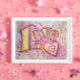 Aquarelle peinture du mot jaune doré "Amour" avec un double coeur. Le rose et le violet soulignent les lettres et le coeur. Un léger éclat de parties scintillant sur le dessus donne au tableau une lueur brillante.