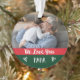 Cet ornement de Noël branché et élégant comprend deux photos de vous et de votre grand-père, avec des blocs de couleurs modernes en rouge et vert festif avec typographie manuscrite blanche et de mignons coeurs griffés. L'ornement dit "nous t'aimons Papa".